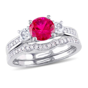 6.0mm Ruby and White Sapphire with 1/8 CT. T.W. Diamond Three Stone Bridal Set in 10K White Gold